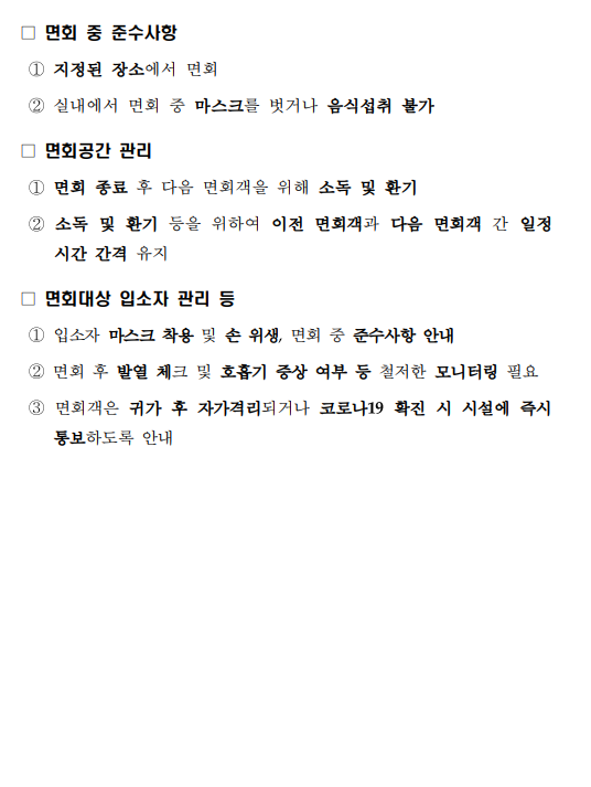 1. 면회 시 음식물 섭취 불가, 마스크 착용등 방역수칙 준수